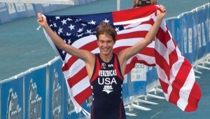 Lukas Verzbicas raises a U.S. flag as he runs towards the finish during the 2011 ITU Junior Triathlon World Championship held in Beijing Sunday, Sept. 11, 2011. Verzbicas won in Beijing on Sunday, scoring a victory for himself and Kevin McDowell, the cancer-stricken friend and athlete that he dedicated the race to. (AP Photo)